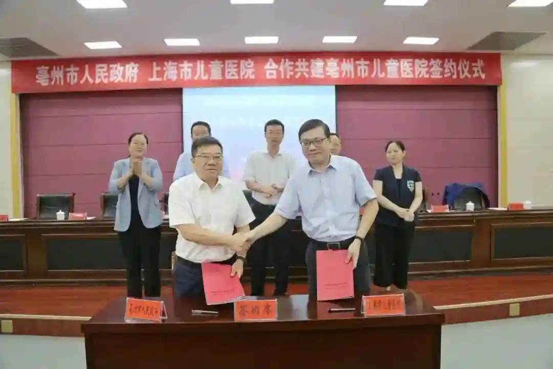 2016年,我院与亳州市人民医院开展儿内科双边合作,为提升亳州地区儿科服务能力、满足当地儿童医疗健康需求做出了积极的贡献。在亳州市启动建设亳州市儿童医院后,2022年9月,我院正式与亳州市人民政府签订《战略合作协议》,筹划合作共建亳州市儿童医院。2023年5月,《长江三角洲城市经济协调会2023年度工作计划》将我院与亳州市人民政府合作共建亳州市儿童医院项目纳入为重点项目。