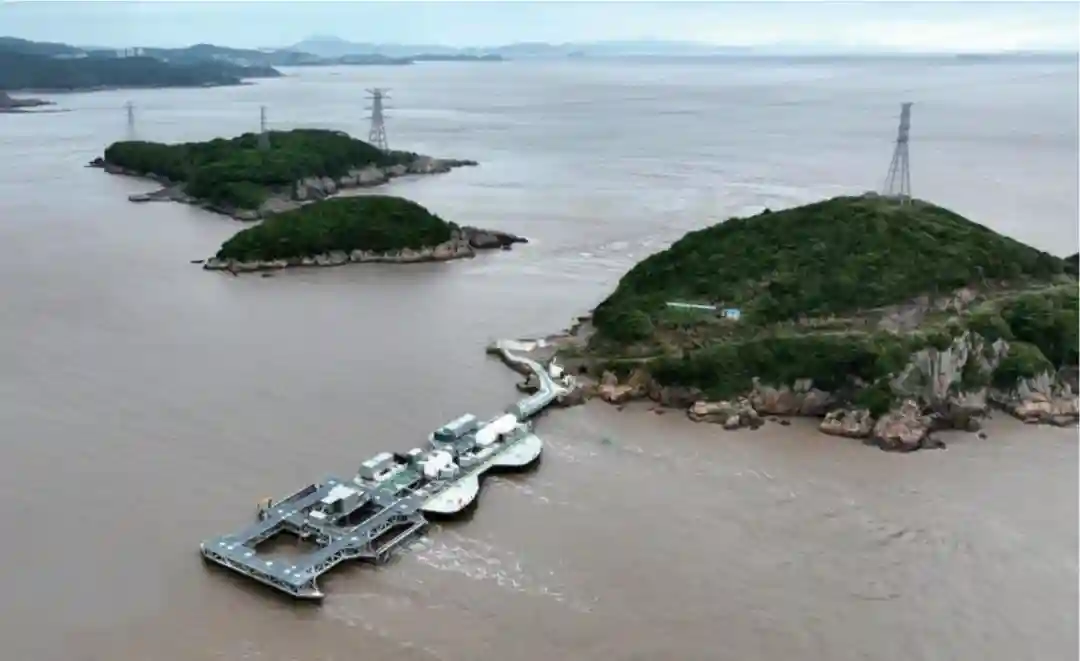 2022年2月24日,世界最大单机潮流能发电机组“奋进号”在舟山岱山秀山岛海域启动下海(图22),并于4月29日正式并入国家电网,通过舟山五端柔直工程实现潮流能全额消纳。