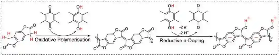 华南理工大学发光材料与器件国家重点实验室黄飞团队联合南方科技大学、北京大学研究团队,创新地提出了一种新的n型导电聚合物合成策略,利用醌类氧化剂可逆的氧化还原特性,将氧化聚合和还原掺杂结合,大幅提高了有机半导体的n型掺杂效率,实现了具备超高电导率及优异稳定性的n型导电聚合物的制备(图19)。合成的聚(苯并二呋喃二酮)(PBFDO)具有超过2000S/cm的电导率及良好的空气稳定性,在有机电子器件中展现出广泛的应用前景。