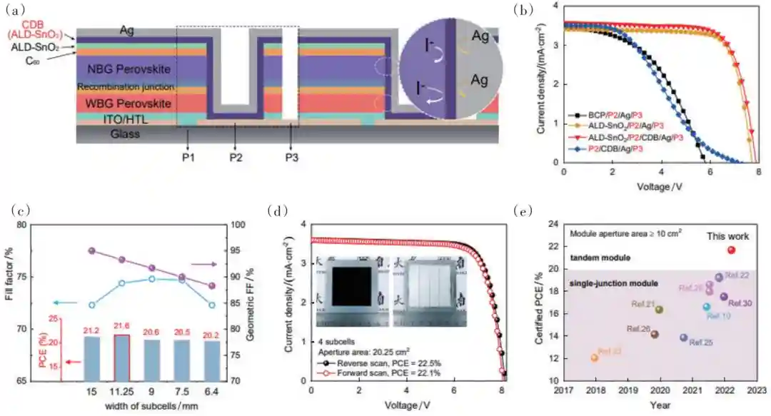 为了进一步推动全钙钛矿叠层电池的产业化,谭海仁团队运用涂布印刷、真空沉积等量产化技术,在国际上首次实现了全钙钛矿叠层光伏组件的制备,开创性地采用原子层沉积(atomiclayerdeposition,ALD)制备致密的电子传输层(ALD-),阻隔组件互连区域钙钛矿与金属背电极的接触,显著提升了组件的制备重复性、光伏性能以及稳定性(图2),实现了国际认证效率高达21.7%的大面积叠层组件,创造了钙钛矿光伏组件新的世界纪录。该研究开辟了大面积钙钛矿叠层电池量产化、商业化的全新路径,被《太阳电池世界纪录表》(solarcellefficiencytables,version59)收录。