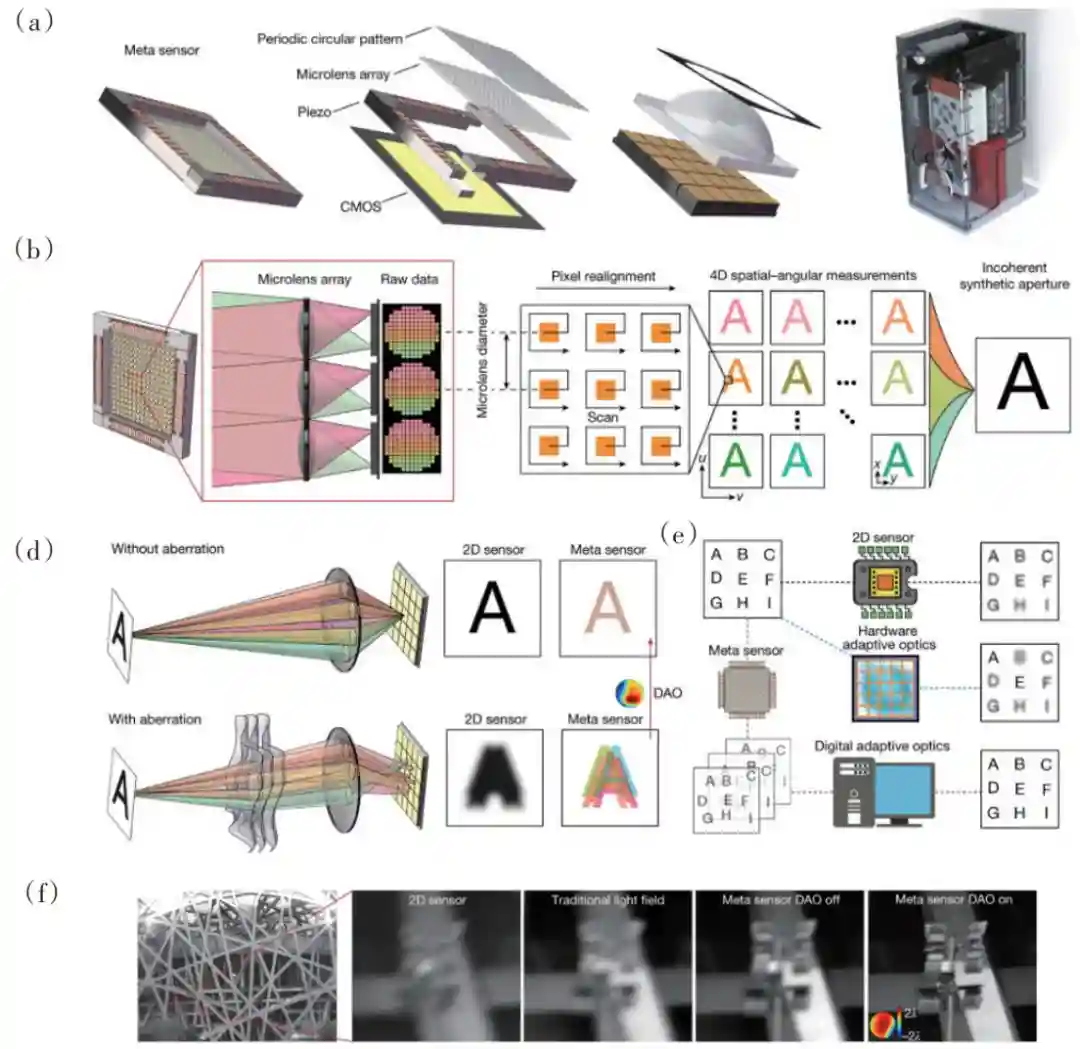 清华大学戴琼海团队提出了一种集成化的元成像芯片架构,为解决这百年难题开辟了一条新路径。区别于构建完美透镜,研究团队另辟蹊径,研制了一种超级传感器,记录成像过程而非图像本身,通过实现对非相干复杂光场的超精细感知与融合,即使经过不完美的光学透镜与复杂的成像环境,依然能够实现完美的三维光学成像(图20)。这一技术解决了长期以来的光学像差瓶颈,有望成为下一代通用像感器架构,而无需改变现有的光学成像系统,将应用于天文观测、生物成像、医疗诊断、移动终端、工业检测、安防监控等领域,带来颠覆性变化。