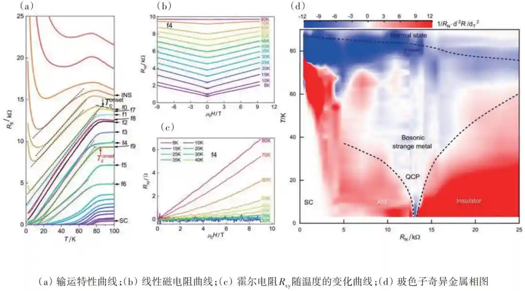 电子科技大学电子薄膜与集成器件国家重点实验室主任李言荣、熊杰团队与美国布朗大学、北京大学物理学院/量子材料科学中心谢心澄、王健,北京师范大学刘海文,四川大学等合作者协同攻关,成功突破了费米子体系的限制,首次在玻色子体系中诱导出奇异金属态。研究团队通过在高温超导钇钡铜氧(YBCO)薄膜中精准构筑纳米网孔阵列,实现了对玻色子相干性、耗散能等物性的跨尺度调控,在量子相变临界区发现了电阻随温度与磁场线性变化的奇异金属态(图11)。同时,低于超导临界温度时,体系霍尔电阻急剧减小为零,并且存在与库珀电子对相关的h/2e(h为普朗克常数,e为基本电荷)超导量子磁电阻振荡,证明体系的载流子是玻色子。研究团队进一步通过标度分析,发现玻色子奇异金属的电阻由温度与磁场简单的线性相加决定,证明了电阻在量子临界区与体系内在的能量尺度无关,满足标度不变的关系,揭示了玻色子在量子临界区存在奇异的动力学行为;建立了玻色子奇异金属的完备相图,阐释了玻色系统耗散量子相变的物理图像。该研究为理解凝聚态物理中奇异金属的物理规律、揭示奇异金属的普适性、完善量子相变理论奠定了科学基础,对揭示耗散效应对玻色子量子相干的定量影响、推动未来低能耗超导量子计算以及极高灵敏量子探测技术的发展具有重要的理论和实际意义。