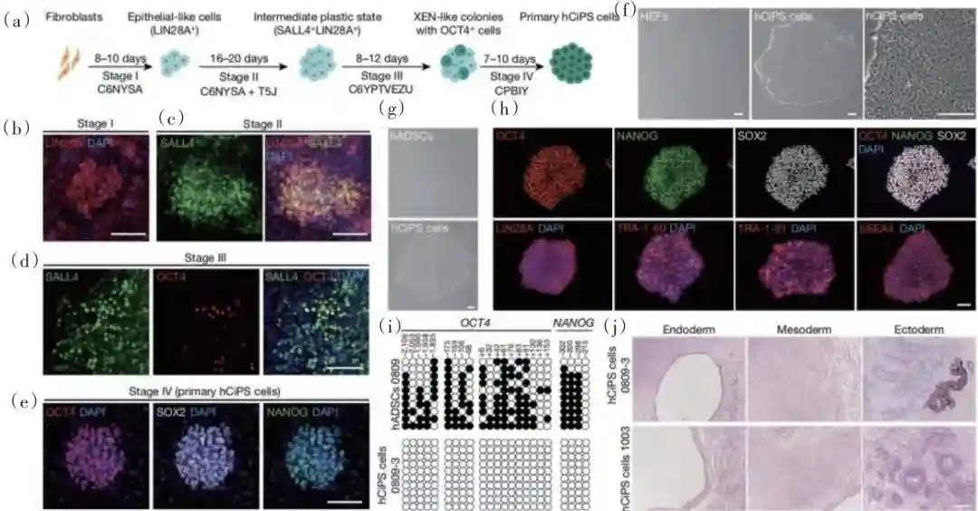 北京大学邓宏魁团队提出了一种全新的诱导人多潜能干细胞制备技术——化学重编程。研究者使用化学小分子诱导人成体细胞转变为多潜能干细胞,相比于传统手段,可以实现细胞重编程过程的高度可控,并且规避了传统转基因操作引发的安全问题,这是国际上首次报道使用化学小分子诱导人成体细胞转变为多潜能干细胞这一突破性研究成果(图17)。研究实现了完全利用化学小分子诱导人成体细胞转变为多潜能干细胞(人CiPS细胞),开辟了人多潜能干细胞制备的全新途径,是继“体细胞核移植”和“转录因子过表达”之后,首次由中国自主研发的新一代人多潜能干细胞制备技术,为国内干细胞和再生医学的发展解决了底层技术上的“瓶颈”问题。这一技术的建立不仅在多潜能干细胞临床应用领域具有巨大的意义和价值,同时为细胞命运调控及再生生物学理论研究方面提供了全新的视角和平台,可为未来再生医学治疗重大疾病带来新的可能性。