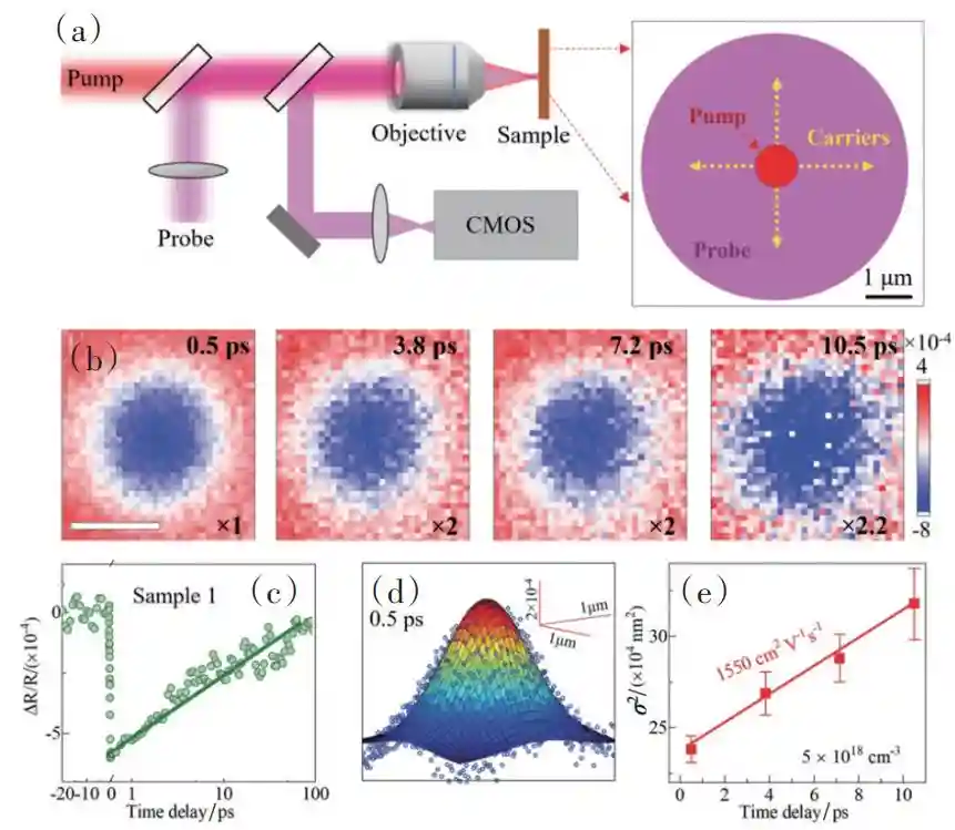 国家纳米科学中心刘新风团队发现了人类迄今为止最佳半导体材料——立方砷化硼(cBAs),为解决CPU主频升级困难的世界级难题迈出关键性一步。研究人员通过反复比较大量样品,综合应用X射线衍射(XRD)、拉曼和带边荧光信号判断样品纯度的方法,挑选出了高纯样品。进一步采用有高灵敏度、高时间和空间分辨能力的超快载流子扩散显微成像系统,详细比较了具有不同杂质浓度的立方砷化硼的载流子扩散速度,在世界上首次在高纯样品区域测定立方砷化硼材料的真实迁移率约为1550/(V·s)。该团队还通过高能量(3.1eV,400nm)光子激发,发现了长达20ps的热载流子扩散过程,其迁移率大于3000/(V·s)(图5)。本研究测定了立方砷化硼高的载流子和热载流子迁移速率,以及其超高的热导率,表明其可以广泛应用在光电器件、电子元件中,为当前芯片散热和算力提高的瓶颈问题指明了方向。
