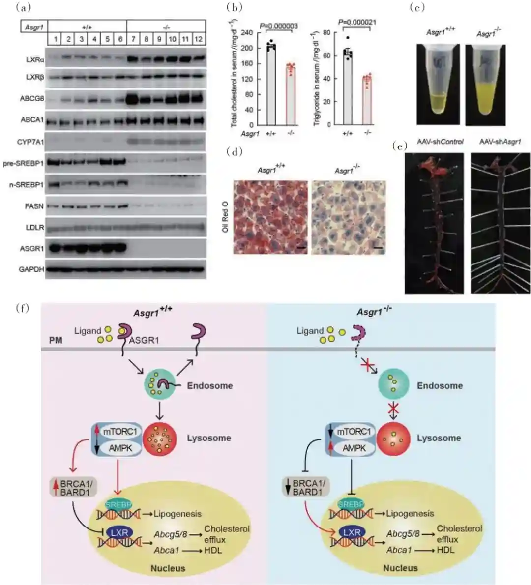 ASGR1是一种糖蛋白受体,主要在肝细胞膜上表达。全基因组关联分析显示ASGR1基因突变与低血脂相关,但是分子机制并不清楚。武汉大学宋保亮团队发现促使胆固醇外排从而降脂的新方法。研究人员用RNAi或中和抗体抑制ASGR1功能,促使胆固醇外排入胆汁,进一步通过粪便排出机体,从而降低血液和肝脏中的脂质水平(图6)。研究团队还研发了ASGR1的中和抗体,该抗体可以将小鼠的血清总胆固醇水平降低50%,同时将血清甘油三酯水平降低22%。研究表明该抗体可以有效促使胆固醇外排,并与现有降脂药物(如他汀和依折麦布)联用起到更加显著的降脂效果。该研究为研发促使胆固醇外排的降脂药物奠定了重要基础,具有潜在的经济和社会效益。