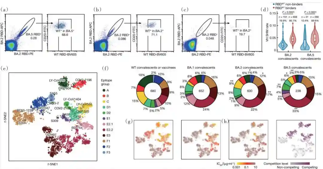 北京大学生物医学前沿创新中心、昌平实验室谢晓亮/曹云龙团队通过高通量单细胞测序、分离并表征上千个新冠单克隆中和抗体后,发现奥密克戎突变株、、新亚型呈现出更强的免疫逃逸能力,并且对奥密克戎感染者康复后血浆出现了显著的中和逃逸现象,证明通过奥密克戎感染实现群体免疫来阻断新冠传播无法实现。研究人员还进一步对不同免疫背景人群中分离得到的抗体进行了大规模中和测定和逃逸图谱表征,发现由于“免疫印迹”现象的存在,奥密克戎亚型变体突破感染后产生的抗体多样性逐渐降低(图3)。另外,研究证明广谱中和抗体药物组合SA55+SA58,特别是SA55,仍然强效中和所有主要突变株和未来短期内可能流行的突变株,且同时具有治疗和预防作用。这项研究前瞻性地对病毒未来突变演化方向进行了预测,为广谱疫苗和抗体药物的设计与研发提供了宝贵的理论与数据支持。