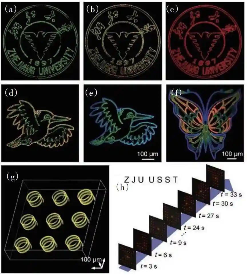浙江大学邱建荣团队、之江实验室谭德志团队联合上海理工大学顾敏团队、南方科技大学刘召军团队、丹麦奥尔堡大学岳远征团队首次发现了飞秒激光诱导复杂体系微纳结构新现象,揭示了空间选择性介观尺度分相和离子交换的规律,开拓了飞秒激光三维极端制造新技术,在无色透明介质内部实现了带隙可控发光连续可调的任意三维半导体纳米晶结构。利用这种3D纳米结构,研究团队成功演示了在超大容量超长寿命信息存储、高稳定Micro-LED列阵和动态立体彩色全息显示等前沿领域的重要应用(图12)。