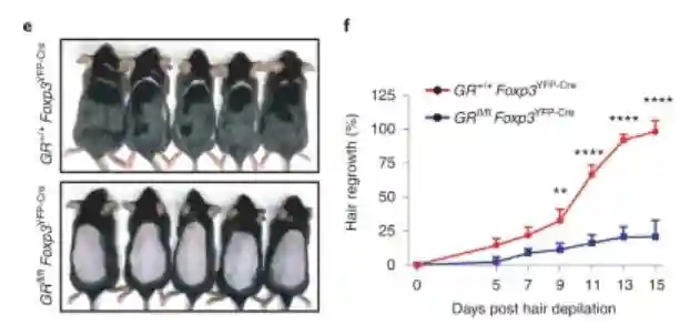 首先,研究人员在正常小鼠和Treg细胞中缺乏糖皮质激素受体的小鼠中诱导了脱发。两周后,他们观察到小鼠之间存在的显著的差异:正常小鼠长出了毛发;而没有糖皮质激素受体的小鼠可以说是“一毛不拔”,毛囊干细胞一直处于休眠状态,无法被激活,增殖与分化。
