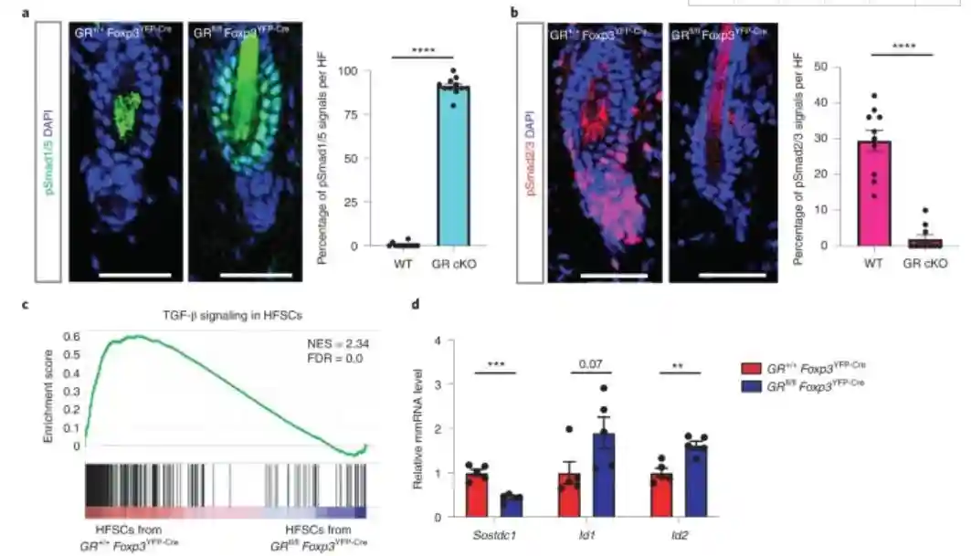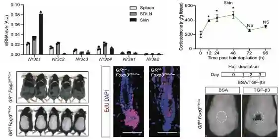 在该研究中,研究人员首先观察到糖皮质激素受体在皮肤中的Treg细胞高表达,以及对皮肤毛囊进行脱毛损伤后诱导分泌的糖皮质激素水平增高。