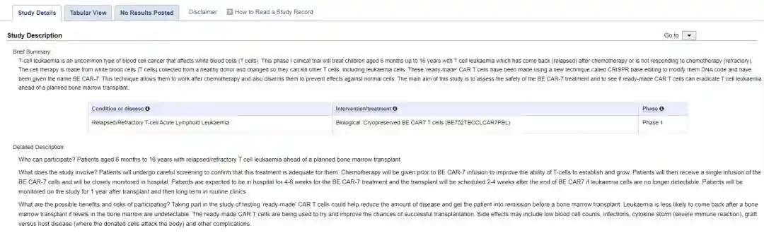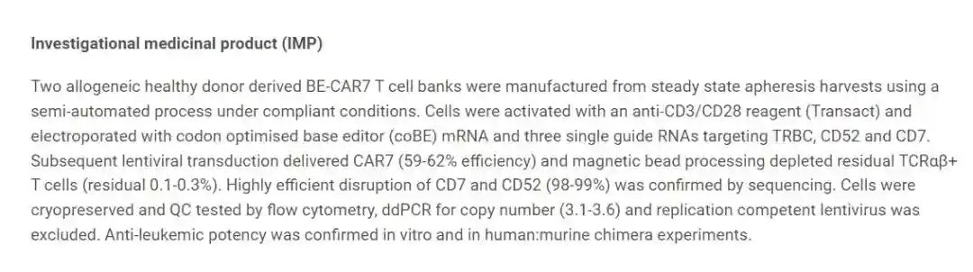 这是一款多重碱基编辑的通用型CAR-T细胞疗法,由来自UCL的WaseemQasim教授团队设计和开发,正在进行研究者发起的临床研究(IIT)。