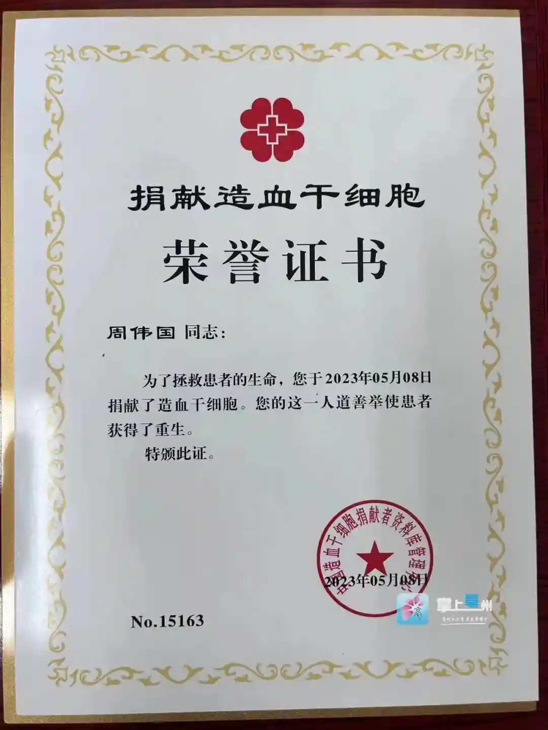 据了解,周伟国是蒙城县的第7例造血干细胞捐献者,也是亳州市第24例造血干细胞捐献者。