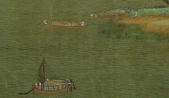 在这种争相以“微画”献艺的时代,王希孟是不可能回避的,只能是首当其冲,其《千里江山图》卷中的屋宇、桥梁等建筑和舟船乃至细小的人物活动均显示了画家在微画技艺方面的超强水平,那细小如蚁的设色人物竟能画得姿态自如,衣冠清晰,在现存的古代绘画中,其精微的程度几乎无人企及。可以看出,画家在每一个艺术关卡上特别是在量化方面努力超越前人,这来自于他内心的冲击力和徽宗的“诲谕”。