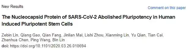 2020年3月28日,广东省BeatingOrigin再生医学有限公司,中山大学,广州医科大学等多机构合作在预印版平台medRxiv在线发表未经同行评审的题为“TheNucleocapsidProteinofSARS-CoV-2AbolishedPluripotencyinHumanInducedPluripotentStemCells”的研究论文,该研究为了研究nCoVN对人诱导的多能干细胞(iPSC)的生物学作用,通过慢病毒表达系统产生了基因工程过表达nCoVN的iPSC(iPSC-nCoVN)。出乎意料的是,nCoVN表达两周后,iPSC的形态和增殖率发生了变化。