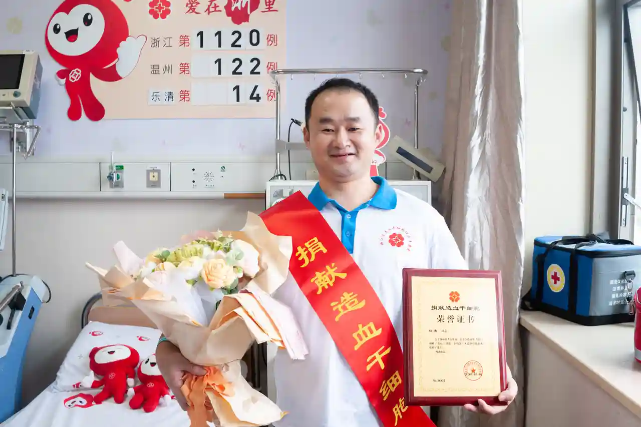 完成捐献的杨勇手捧献花和证书。照片由温州市红十字会提供