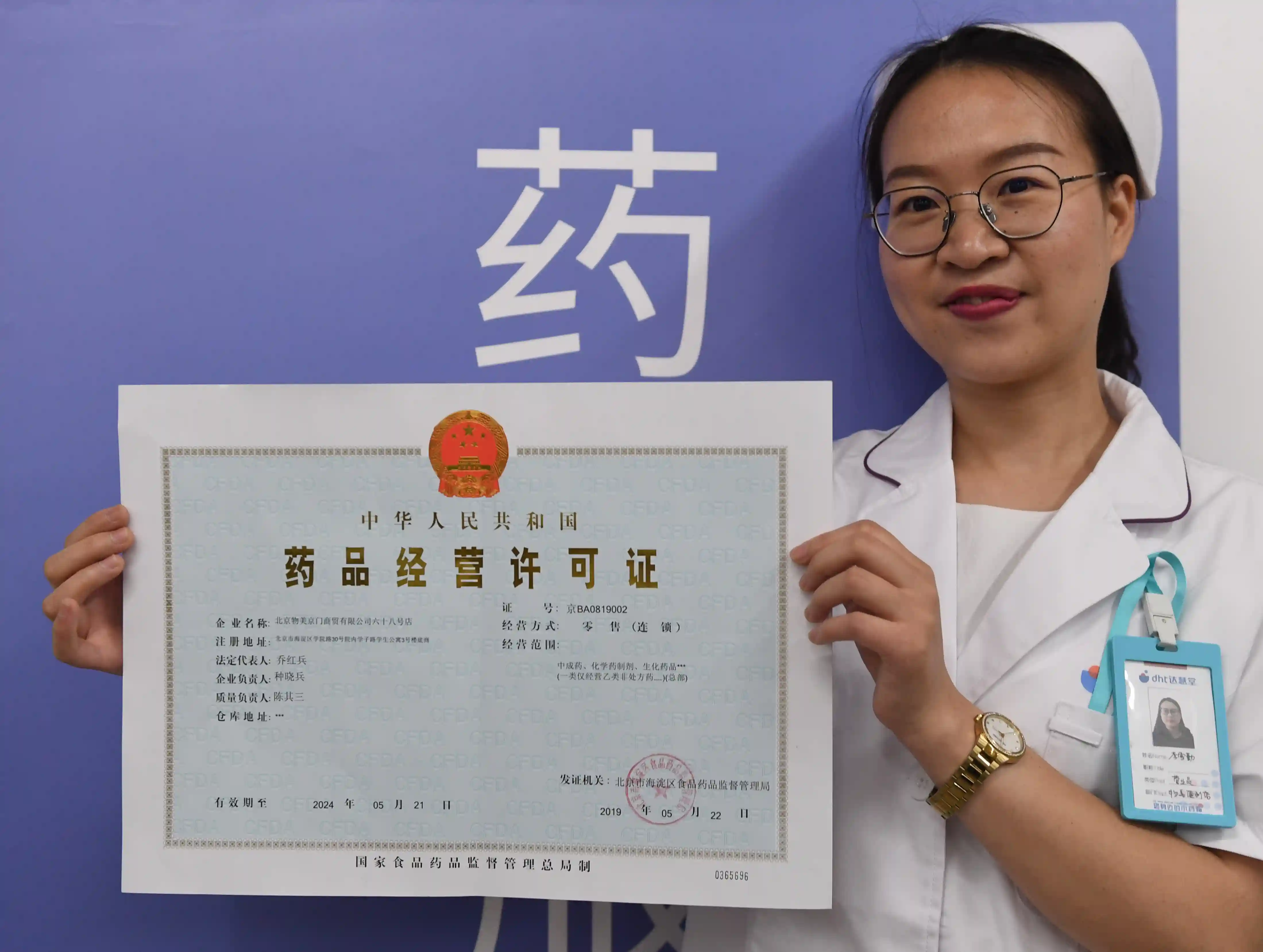 工作人员展示《药品经营许可证》。摄影/新京报记者吴宁