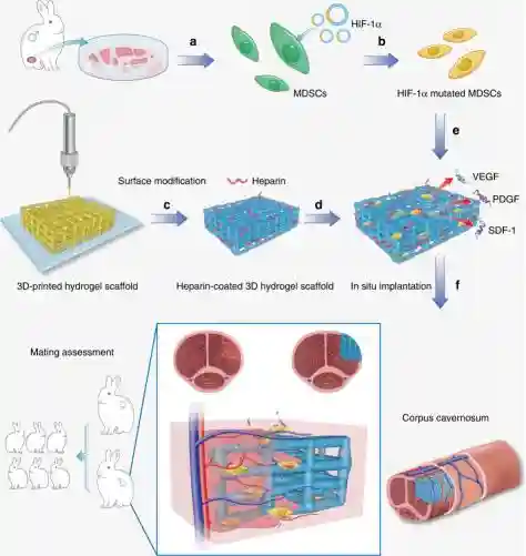 “如果海绵体修复是‘盖房子’,3D打印的水凝胶支架是房子的‘框架’,微血管系统重建就是房子的‘砖瓦’。”安庚介绍,研究人员利用干细胞技术,向其中植入了高表达缺氧诱导因子(HIF-1α)的肌源性干细胞(MDSCs),还通过肝素与聚L-赖氨酸(PLL)的逐层组装,将肝素沉积到3D打印的水凝胶支架上,刺激植入部位血管形成,制备生物工程血管化阴茎海绵体。
