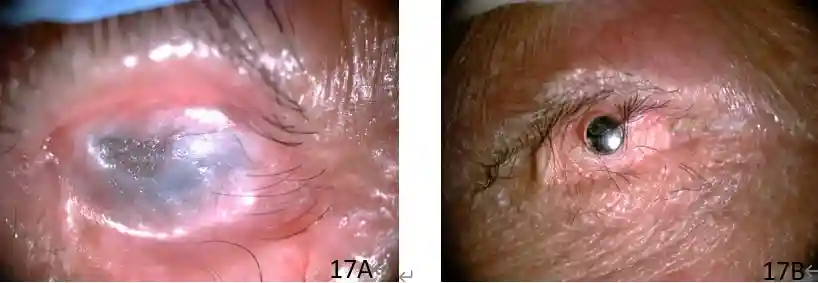 又比如对于伴有倒睫及瘢痕性内翻的OCP患者来说,最重要的是纠正瘢痕性睑内翻以减少局部的角结膜损伤,打破炎症周期,阻止疾病进展,因此需要行眼睑手术;对于病变晚期的OCP患者,一些外科手术干预是很有必要的,例如在角膜病变严重的情况下进行角膜移植手术治疗,最大程度地改善患者的视力。