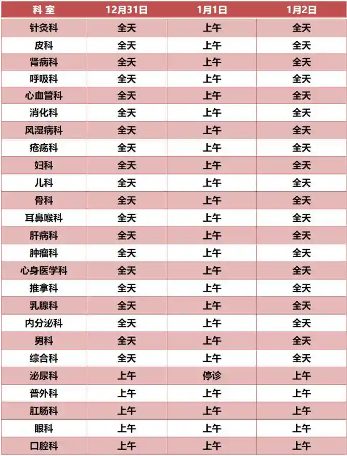 12月31日至1月2日:上午半日,开放时间上午08:00-12:00(11:30停止取号)