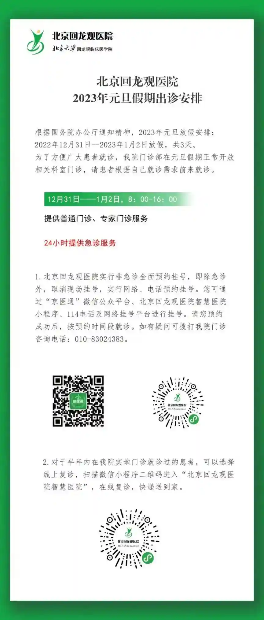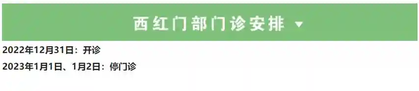 2022年12月31日(星期六)、2023年1月2日(星期一),医院上午半天门诊,儿科全天门诊;