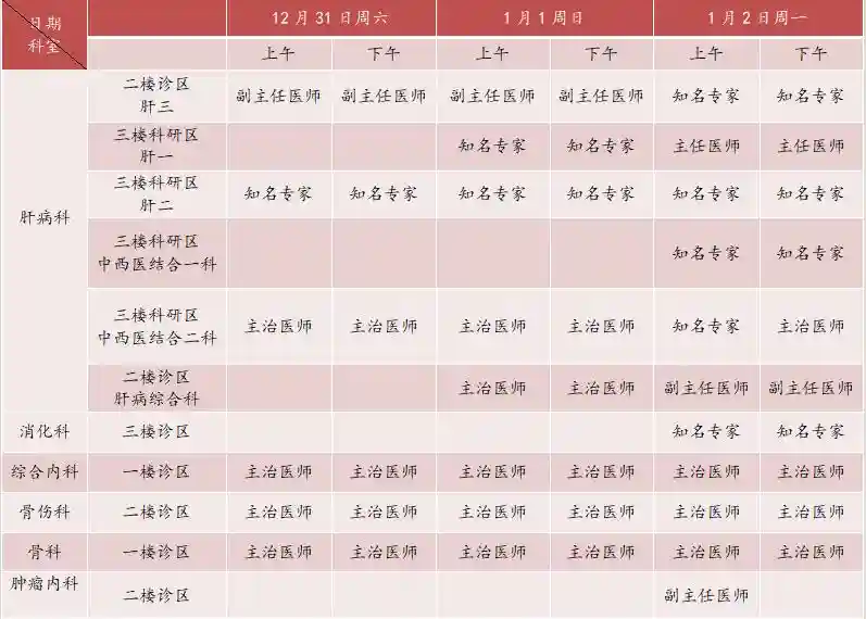 【肝病与肿瘤介入治疗中心门诊】:1月1日上午有专家门诊,其余时间停诊。