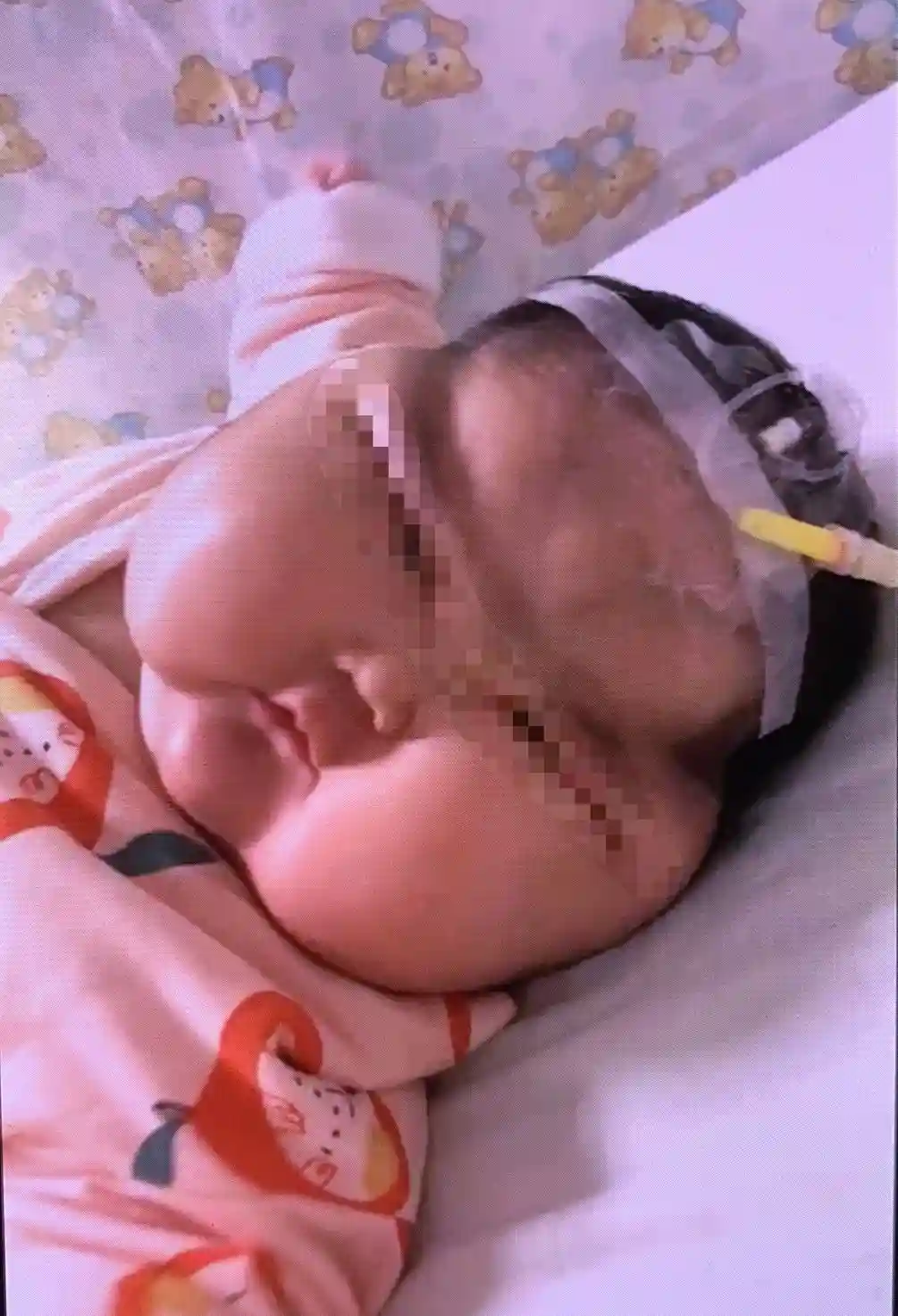 在南京儿童医院就诊时,柚子的眼睛已经眯成缝,需要特定的噘嘴动作才能睁开。受访者供图