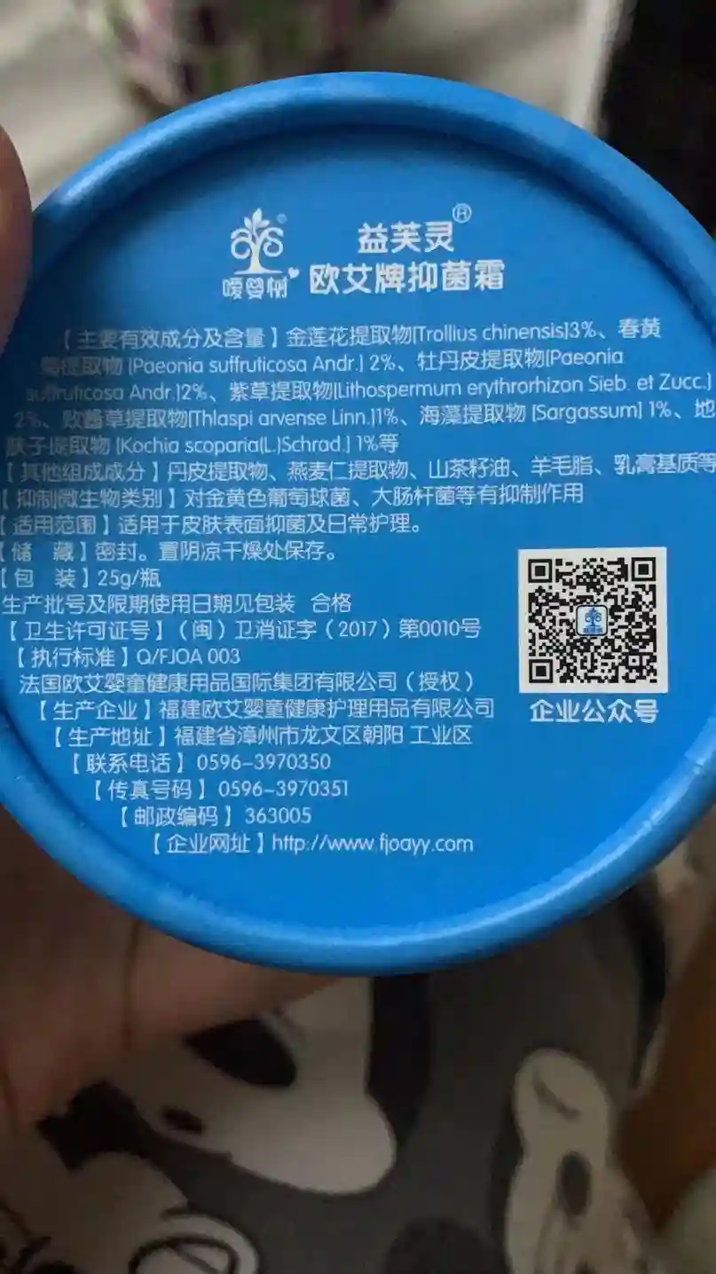 新京报记者在查询天眼查时发现,福建欧艾婴童健康护理用品有限公司成立于2017年4月5日,经营范围主要是卫生用品【抗(抑)菌制剂(液体、膏剂、凝胶、粉剂)(净化)】的生产、销售;发用类、护肤类、香水类、美容修饰类化妆品的生产、销售;化妆品、日用品百货、一类医疗器械、保健食品的销售;中药饮片的研发、生产、销售。旗下品牌有“嗳婴树”与“开心森林”,“益芙灵”多效特护抑菌霜是“嗳婴树”品牌下的产品。