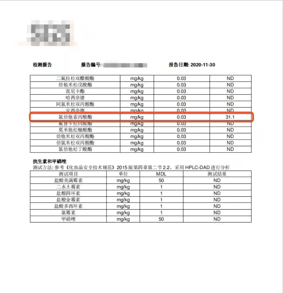 据该检测机构提供给新京报记者的检测报告显示,11月30日送检的“益芙灵”多效特护抑菌霜,参照GB/化妆品中41种糖皮质激素的测定,采用LC-MS-MS进行分析得出,该产品中氯倍他索丙酸酯的含量为31.1mg/kg。“很少在产品测出,这个含量非常高”。