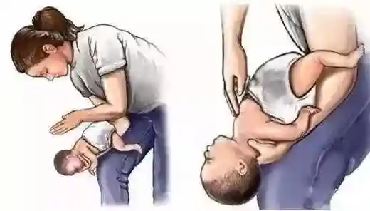 1、救护人坐在椅子上,将婴儿正面朝下放在救护人一侧前臂上,同时一只手捏住孩子颧骨两侧,婴儿头部略低于胸部。