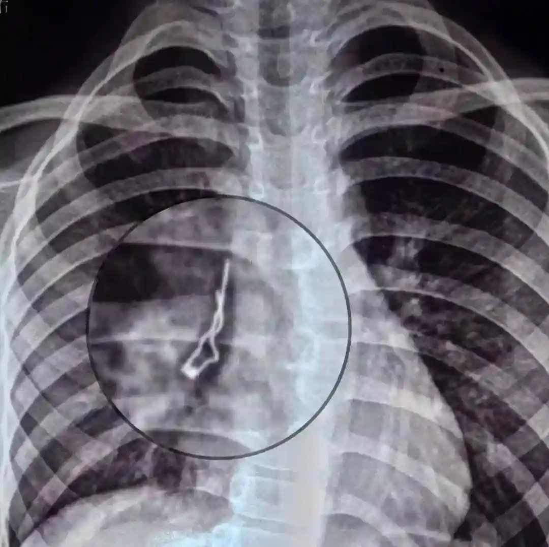 在咸宁一家寄宿小学读书的小路从6月5日开始便有些咳嗽,生活老师给吃了药也不见好转,反而越咳越厉害。12日,爷爷把小宁带到医院就诊,拍片发现肺里有个圆头的异物,上边还有两根细铁丝。小路不肯说吞了什么,当地医院也无法处置,便立刻转诊到省妇幼。