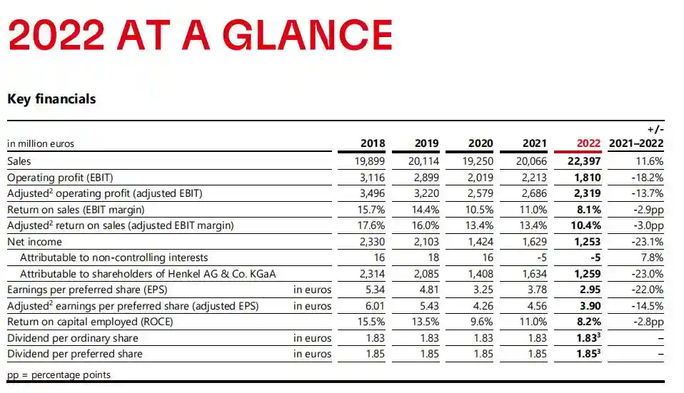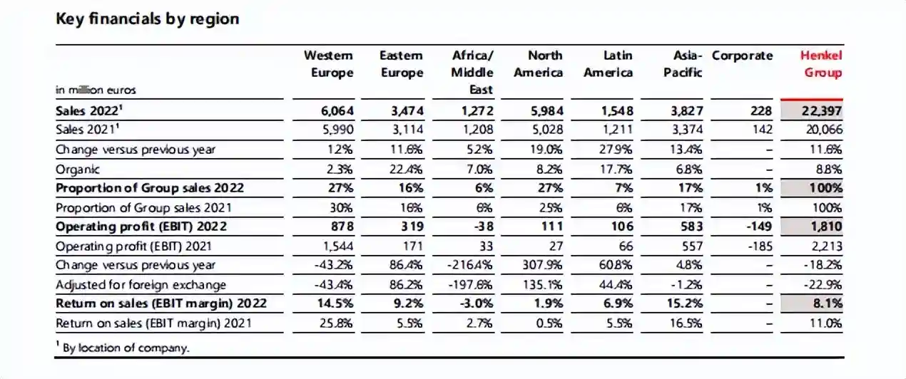 汉高在财报中表示,在极具挑战性的2022年中,原材料和物流价格大幅上涨对集团的盈利能力构成压力,且无法通过积极的价格发展和采取有效措施降低成本提高生产和供应链效率来完全抵消这种压力。但汉高仍然实现了显著的销售增长和强劲的盈利表现,并且实施了重要的战略措施。通过提高价格和持续提高效率,成功地补偿了部分原材料和物流成本的大幅上涨,推动了集团的战略议程的实施。