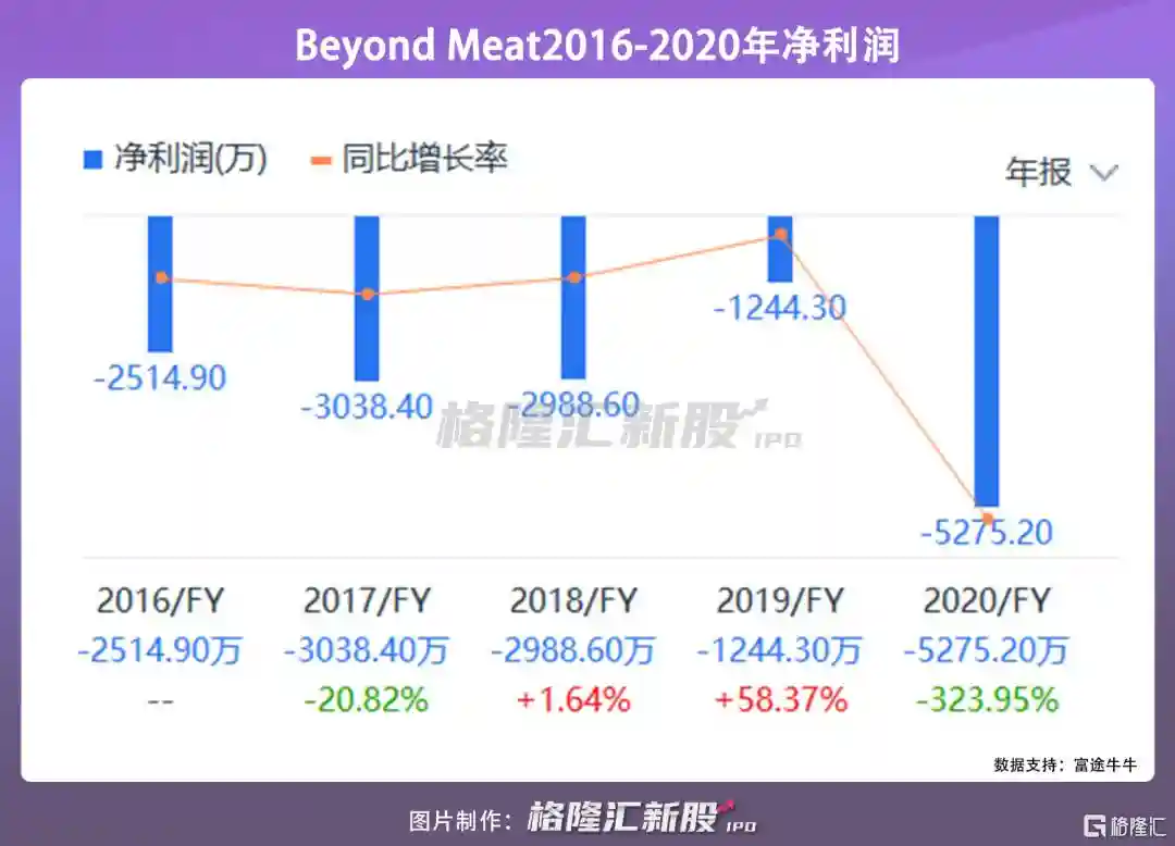 以人造肉第一股BeyondMeat为例,从2016-2020年,虽然其营业收入得益于市场的快速增长从1618万美元一路跃升到2020年的4亿,但亏损也是如影随形。