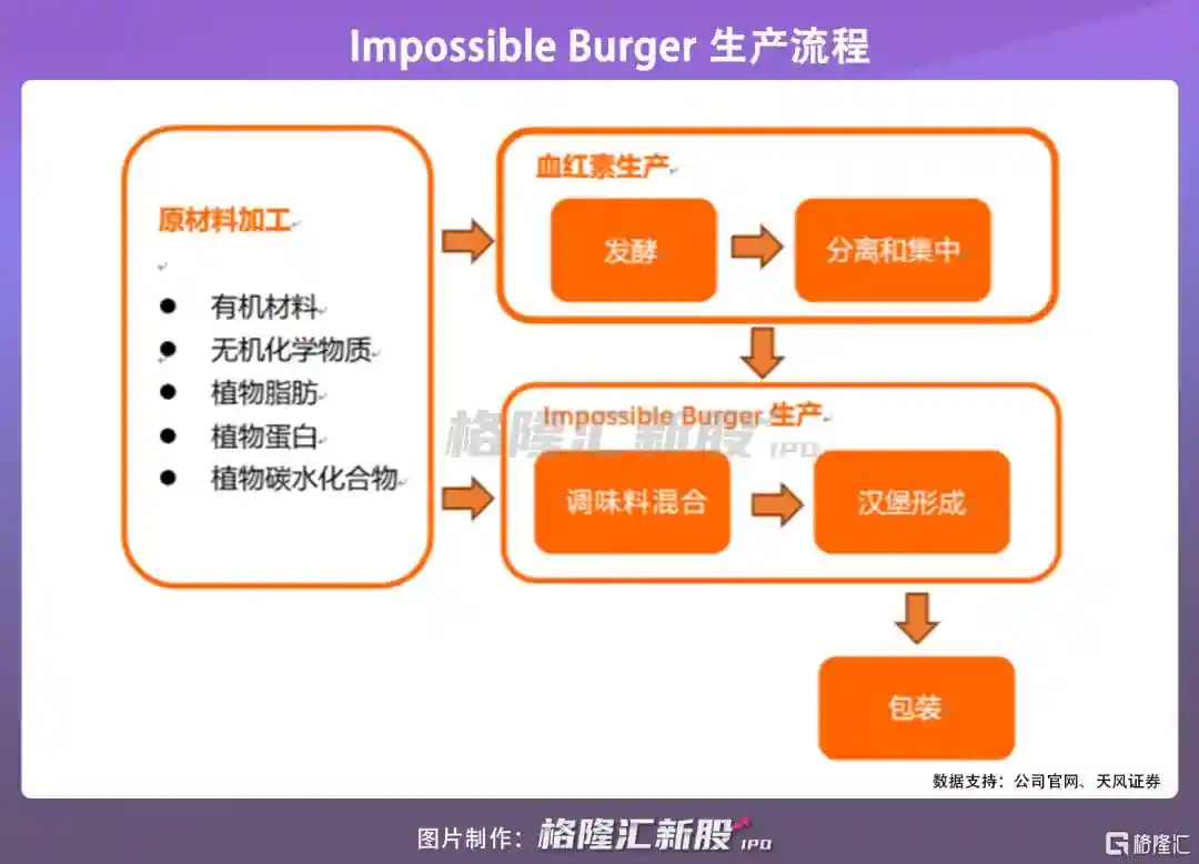 ImpossibleFoods的人造肉核心技术突出。在分子水平上研究动物产品,然后从植物中选择特定的蛋白质和营养素,以再现特定肉类产品的体验和营养。通过基因工程改造的酵母生产豆血红蛋白,使得产品的口味和形态与真肉更加相似,再现了动物肌肉中的关键特征-脂肪、结缔组织,使产品在外观和口感上尽量做到以假乱真。