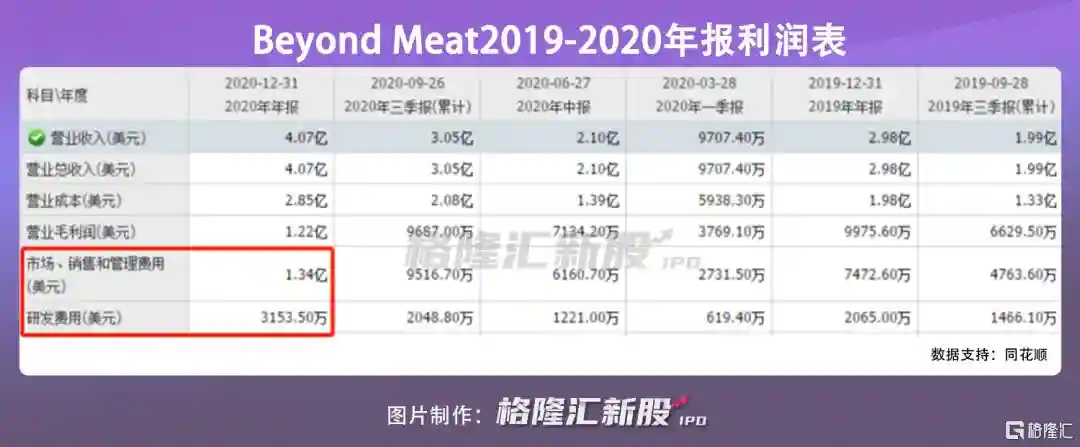 另一个小头则是BeyondMeat的研发费用,2020年报显示研发支出为3153万美元,占据收入的10%左右。从提升规模效应降低成本实现盈利之路的路径上,市场的推广以及技术水平不断改进都是必然要去做的。