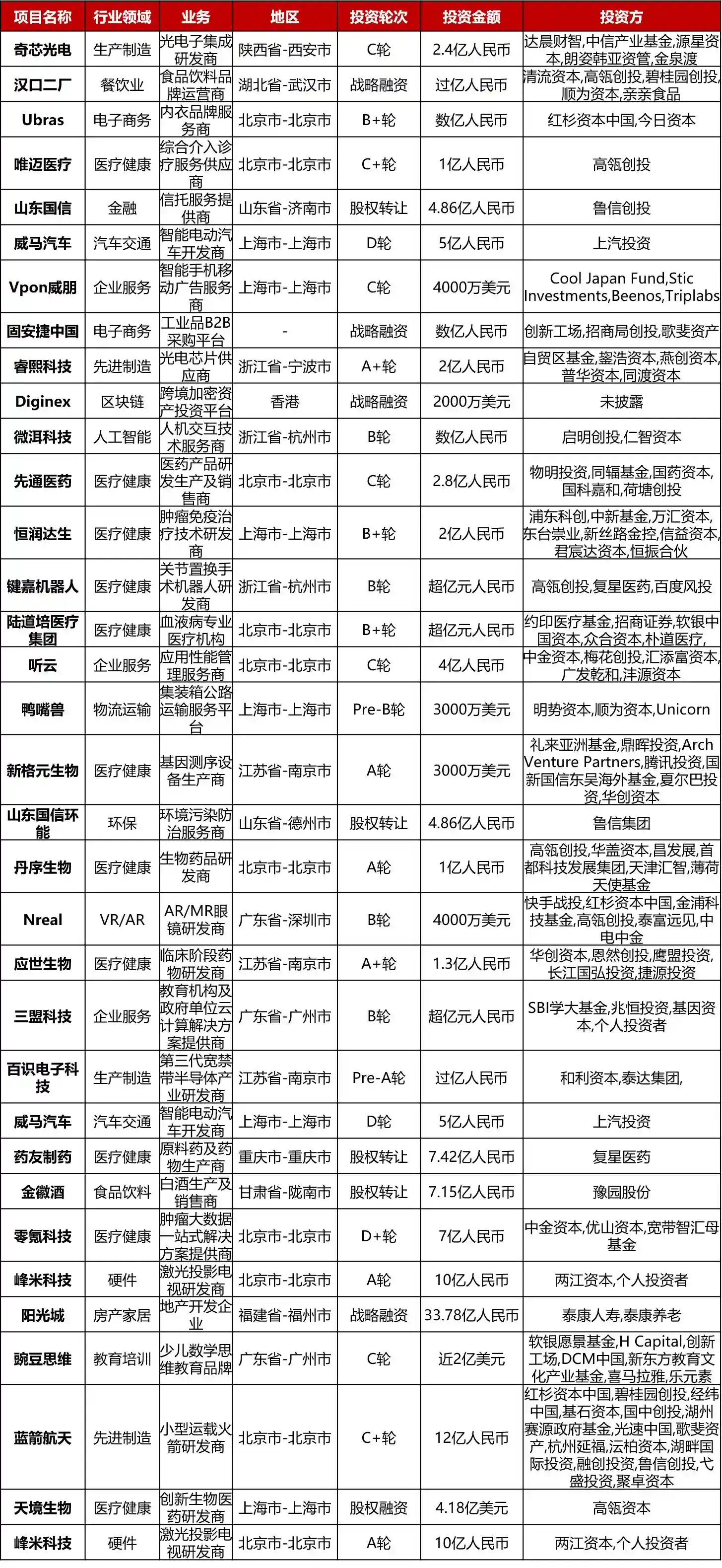 国内融资本周共有34起一亿人民币以上的融资事件: