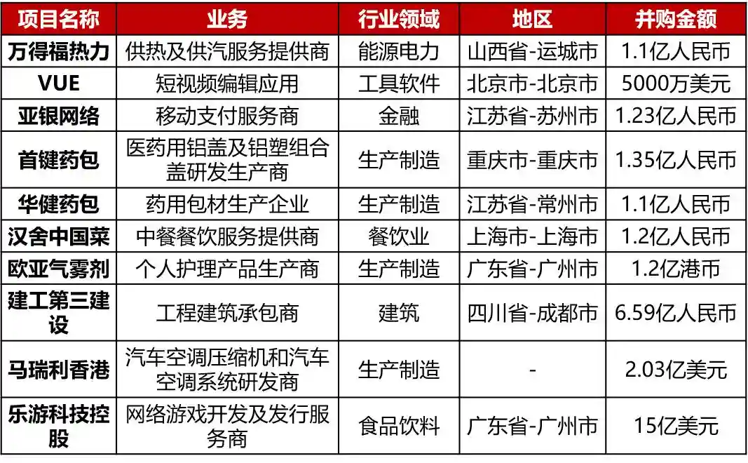 国内亿并购本周共有10起一亿人民币以上的收购并购: