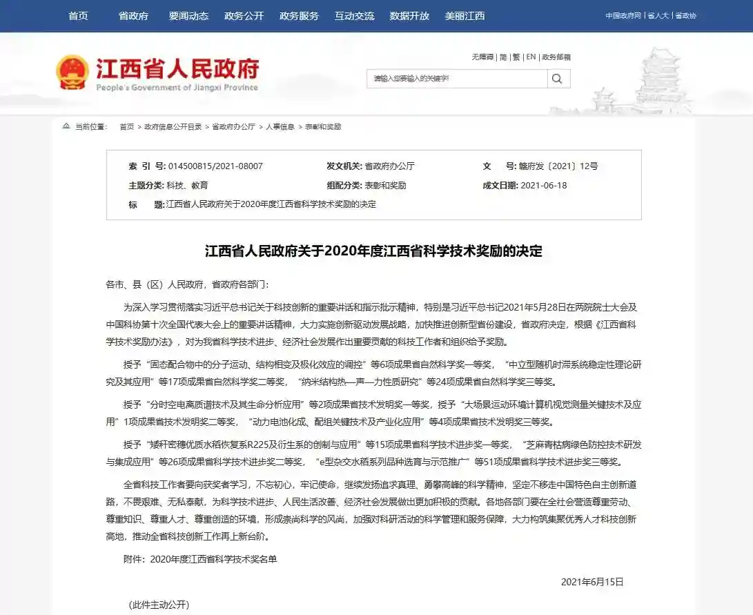 据悉,江西省科学技术奖是我省科学技术领域的最高奖项,旨在鼓励全省科技工作者不忘初心,牢记使命,发扬追求真理、勇攀高峰的科学精神,坚定不移走中国特色自主创新道路,不畏艰难、无私奉献,为科学技术进步、人民生活改善、经济社会发展做出更加积极的贡献。
