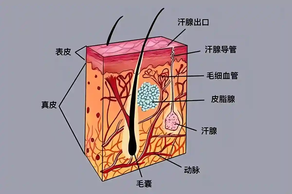 毛囊也位于真皮层,它们负责生长毛发,如头发、眉毛、睫毛和胡须。毛发不仅仅是外观的一部分,也是皮肤的重要组成部分。