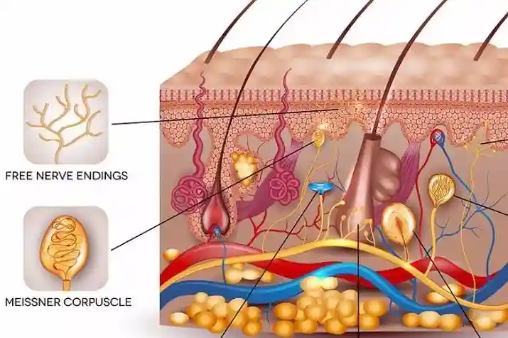 这一层充满了神经末梢,它们是你感知痛觉、触觉、压力和温度的渠道,让你能够敏锐地感知外界变化。尤其是在指尖和足尖,这些地方神经末梢特别密集,所以踢到桌角的时候会疼得一蹦。