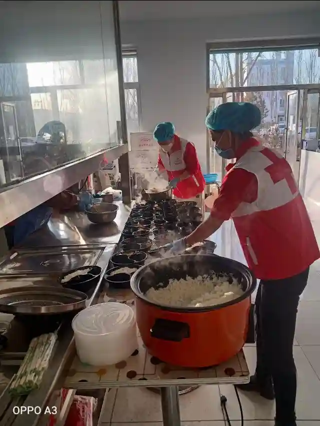 “爱心餐”暖胃更暖心——乌拉特后旗红十字会组织志愿者免费为一线工作人员提供午餐和晚餐,解决了一线防控工作人员吃饭难的问题。16名志愿者分为三组,蔬菜采购人员和送餐人员禁止进入餐厅,每餐所用食材都由餐厅做饭的志愿者接进来,再把做好的饭菜送出去,放心又安全。吃着热气腾腾的“爱心餐”,巴音宝力格镇派驻值守干部王艳林很感动:“过去吃饭就吃个泡面喝点儿矿泉水。红十字会的志愿者变着花样做一些可口的饭菜送过来,暖胃更暖心啊!”疫情防控期间,志愿者们服务832小时,送出668份爱心盒饭,让全旗9个执勤点的30多名一线工作人员吃上了热腾腾的家常饭。