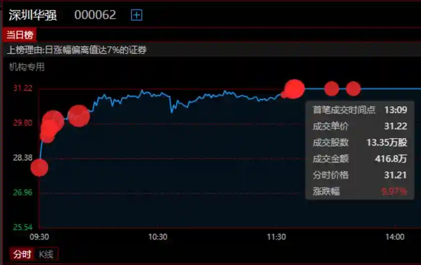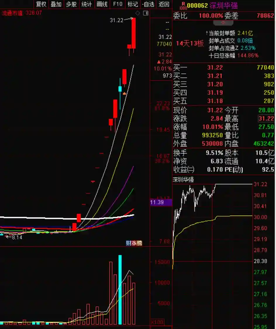 深圳华强,流通市值已经冲到了296亿,全天成交32.61亿,换手率11.12%。