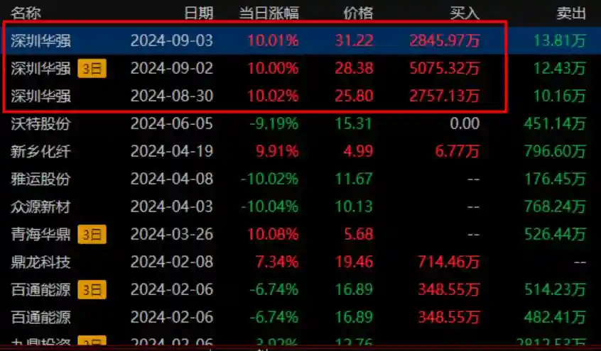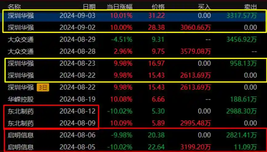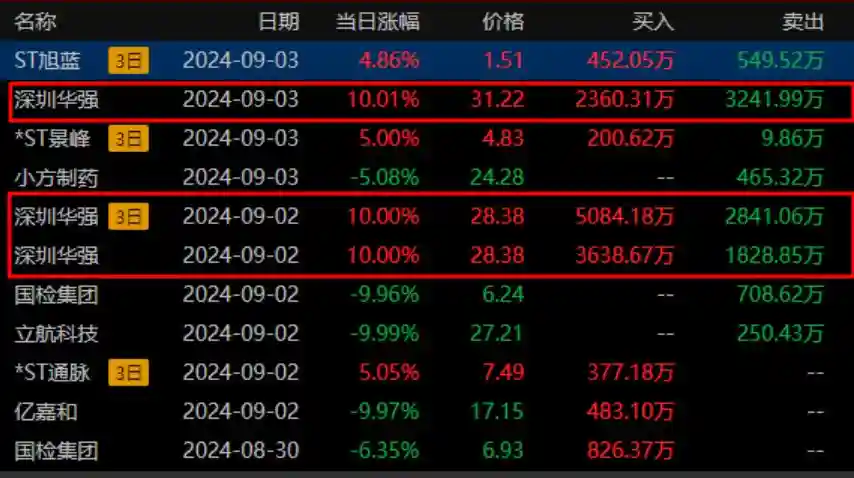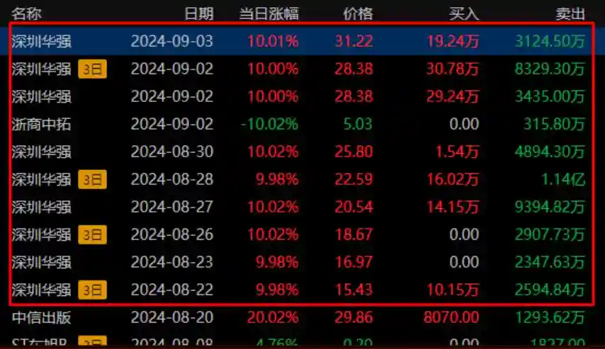 9月3日周二,早盘集合竞价,深圳华强低开1.34%,这是行情启动以来,首次没有溢价的。(先是六一中路撤退,砸出9221万,后是鼓楼南路撤退,砸出9225万,更有十大股东不断撤退,比较刚的游资就剩下陈小群了)