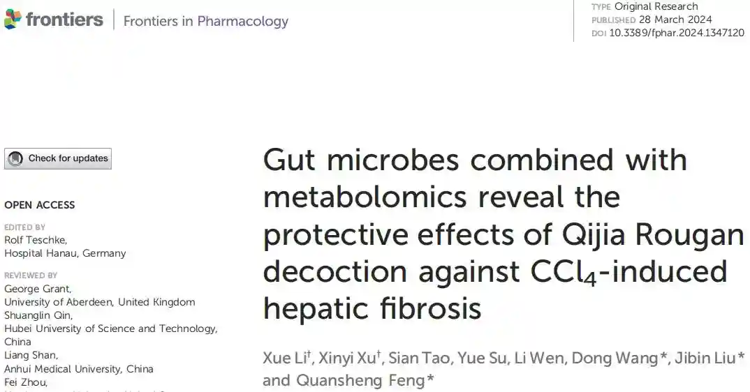 近日,一篇名为“GutmicrobescombinedwithmetabolomicsrevealtheprotectiveeffectsofQijiaRougandecoctionagainstCCl4-inducedhepaticfibrosis”的论文揭示了QJ对CCl4诱导肝纤维化的保护效应。