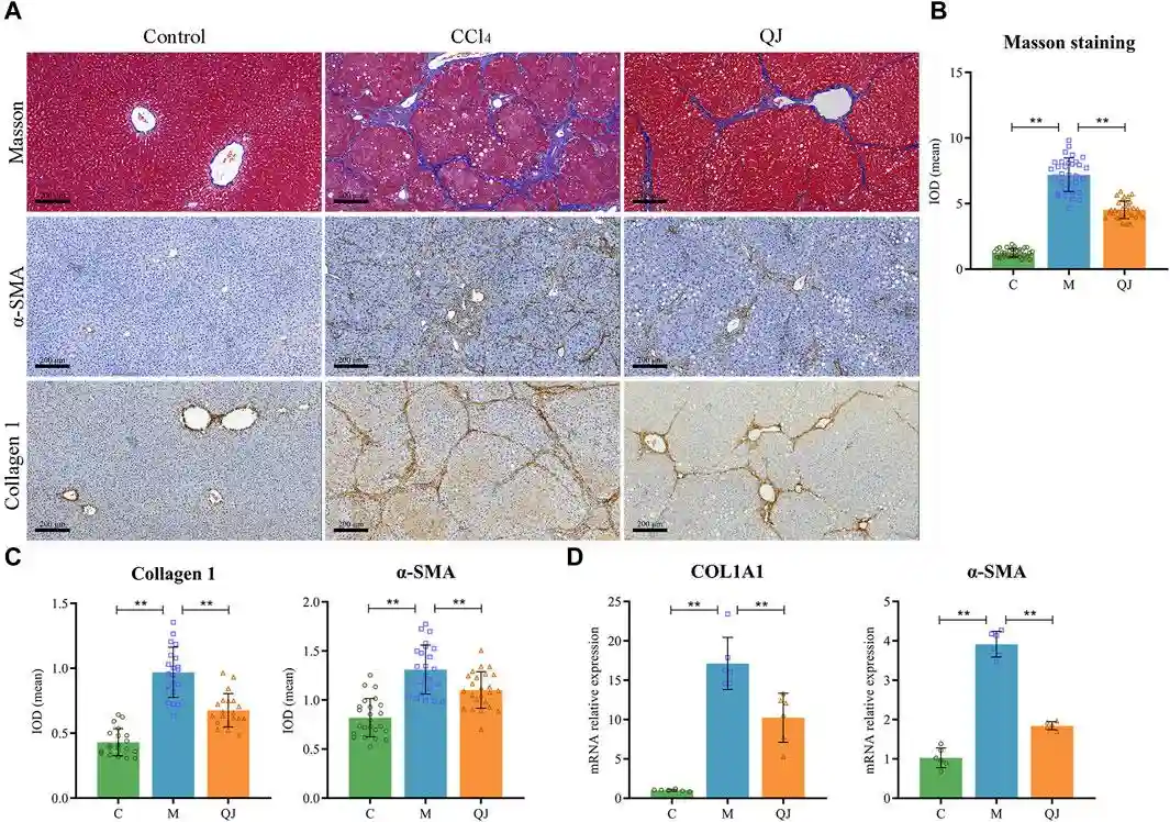 此外,研究通过IHC和qPCR技术检测了各组肝脏中I型胶原和α-SMA的表达水平。结果显示,M组中I型胶原和α-SMA的平均积分光密度值(IOD)及mRNA表达水平显著升高,然而经QJ处理后,这些指标显著降低(图3A、C、D)。上述结果证实了QJ对CCl4诱导的肝纤维化具有抑制效果。