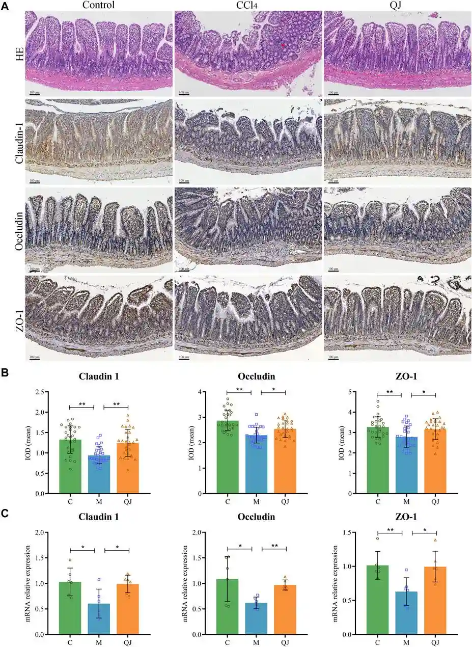 Claudin-1、Occludin和ZO-1是肠紧密连接蛋白(TJPs)的关键组成部分。研究通过IHC和qPCR测定它们的平均积分光密度(IOD)值和mRNA表达水平。回肠的IHC分析结果(图4A、B)表明CCl4处理后Claudin-1、Occludin和ZO-1的平均IOD值显著下降。尽管如此,经QJ处理后,这些蛋白的表达水平得到恢复。此外,qPCR测量的mRNA表达结果与IHC结果相符(图4C)。结果表明,CCl4模型导致TJPs下调,这可能导致有害肠道微生物及其代谢产物通过肠肝轴影响肝脏,但QJ对CCl4诱导的肠上皮屏障损伤具有积极的修复作用。
