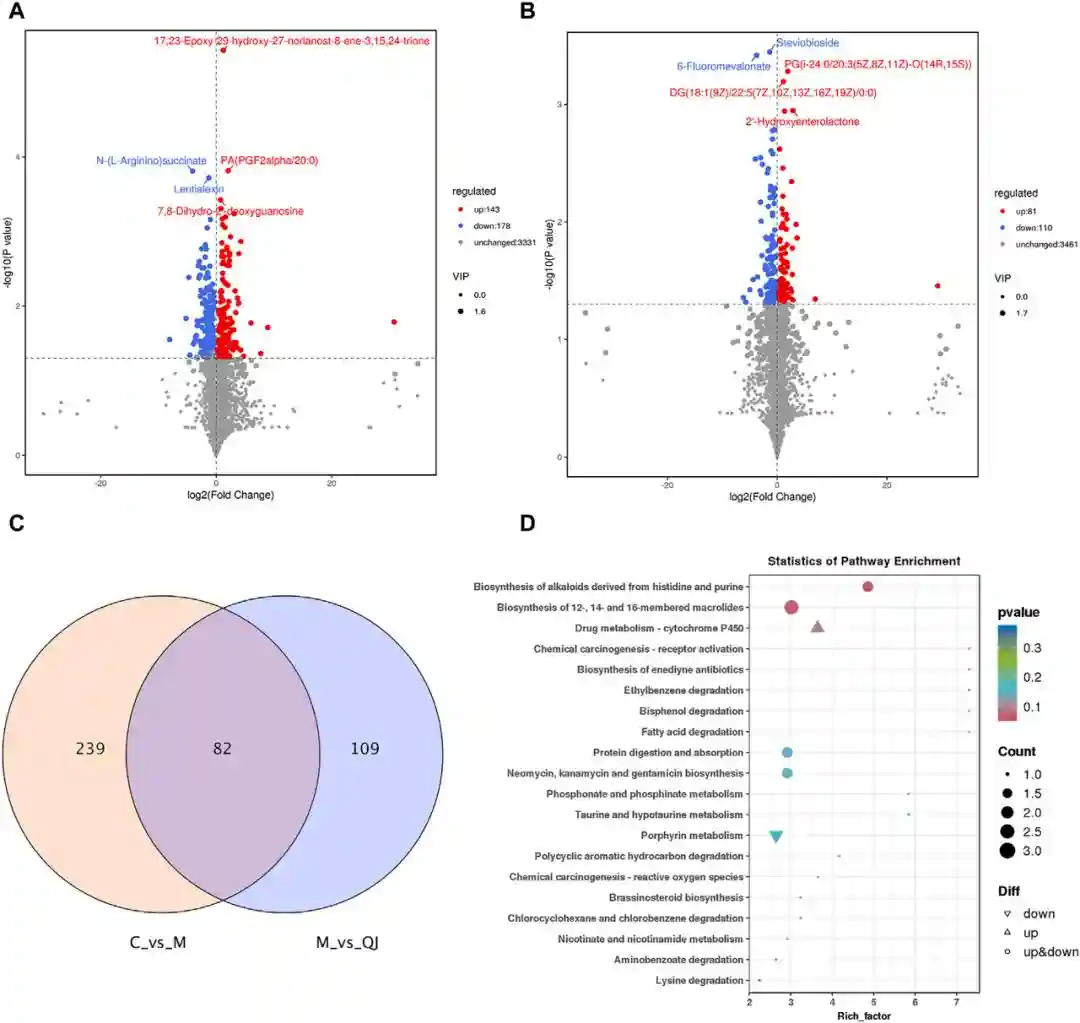 为探究各组的代谢特性,该研究对肠道内容物样本执行了非靶向代谢组学分析。偏最小二乘判别分析(OPLS-DA)揭示了C组与M组、M组与QJ组之间的分离现象。相应的置换检验验证了模型的有效性和可靠性,并未表现出过度拟合现象。火山图揭示了代谢物的差异(图5A、B)。基于M组与QJ组间差异代谢物的分析,研究探讨了QJ抑制HF的代谢途径。相关的KEGG途径包括药物代谢—细胞色素P450、脂肪酸降解、牛磺酸和亚牛磺酸代谢以及赖氨酸降解(图5D)。