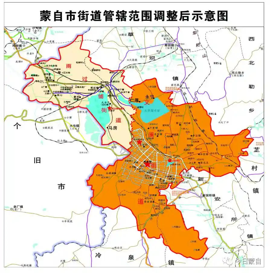 经红河州人民政府研究:同意将隶属文澜街道的马房村民委员会整建制调整到雨过铺街道管辖;将隶属雨过铺街道的仁厚、永宁2个村民委员会整建制调整到文澜街道管辖。