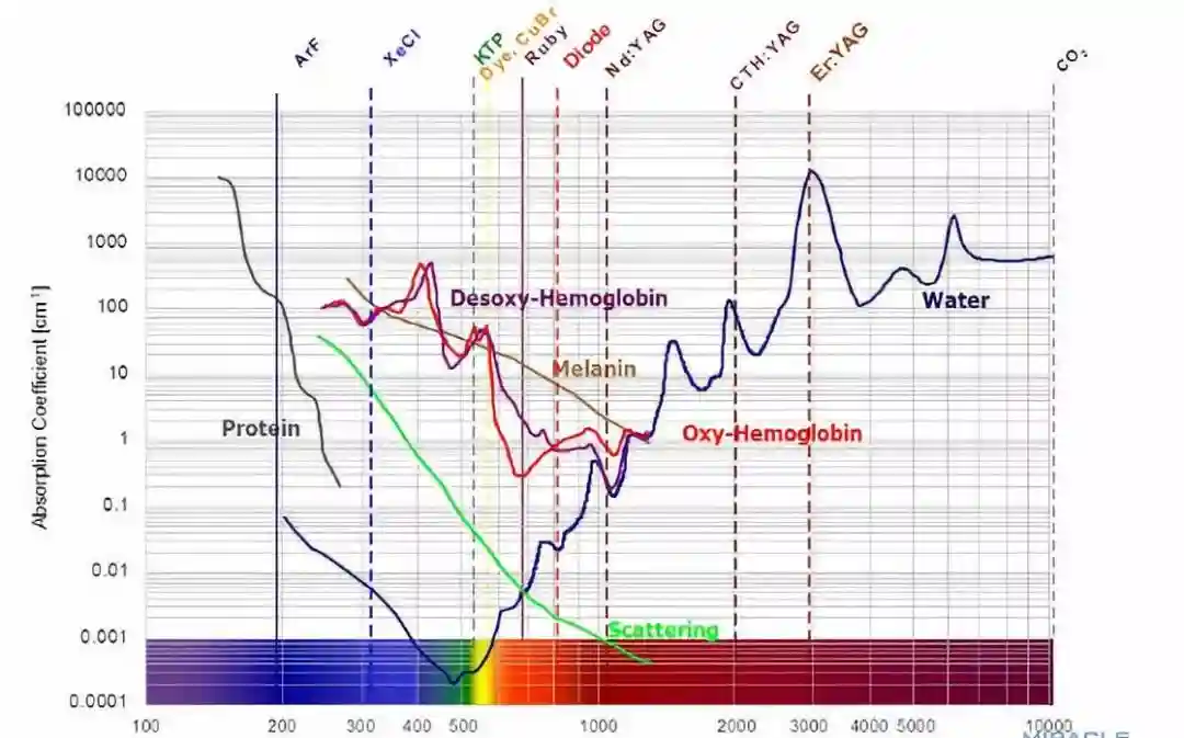 激光治疗疤痕的基本原理就是选择性热作用,皮肤组织内的主要色基血红蛋白、黑色素、水分子。针对血红蛋白的有脉冲燃料激光、光子、532nm-1064nmNd-YAG激光,可以封闭早期增生的毛细血管,抑制疤痕增生。针对黑色素的激光主要是调Q激光,如Nd-YAG激光、红宝石激光和绿宝石激光,对于色沉或粉尘沉积有良好治疗效果。针对水分子的比较多如CO2激光、铒激光、红外激光等,以及超声、射频、等离子等,这类光电主要是产生合适的热损伤,激发组织的再生修复。