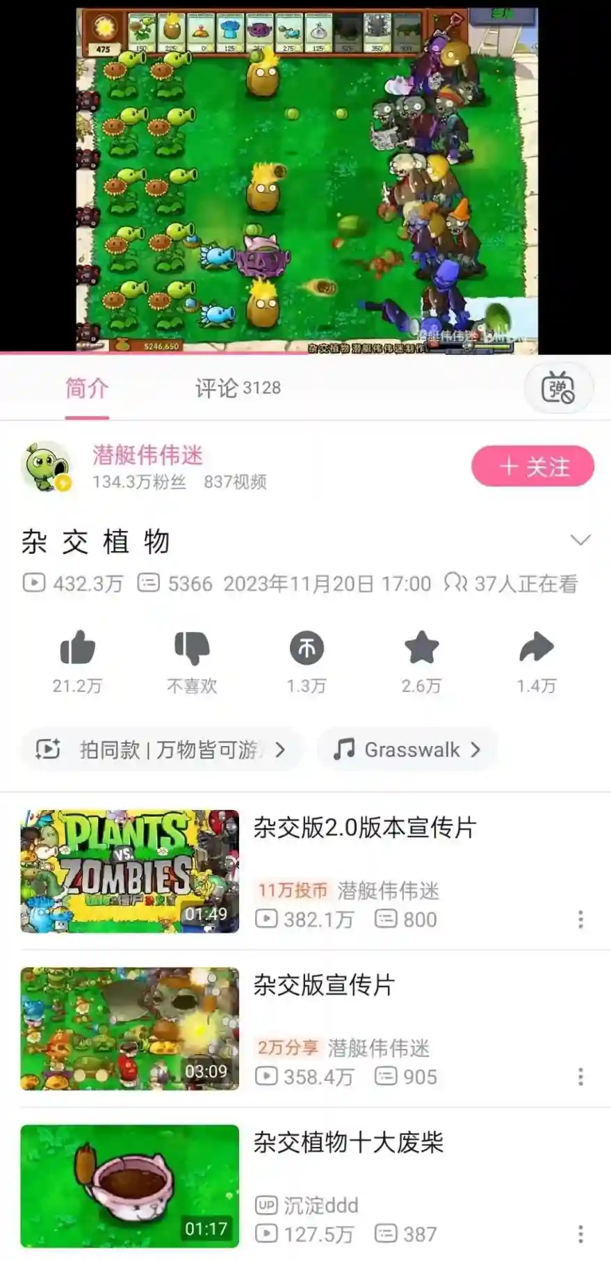 这是由B站上的UP主“潜艇伟伟迷”基于初代《植物大战僵尸》(简称PVZ)制作的魔改版本,特色是将不同植物进行“杂交”,诞生出令人脑洞大开的全新物种。