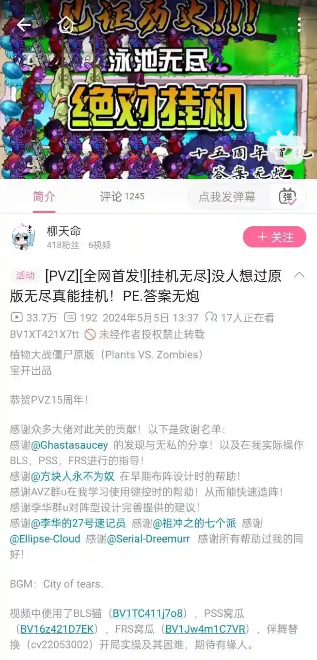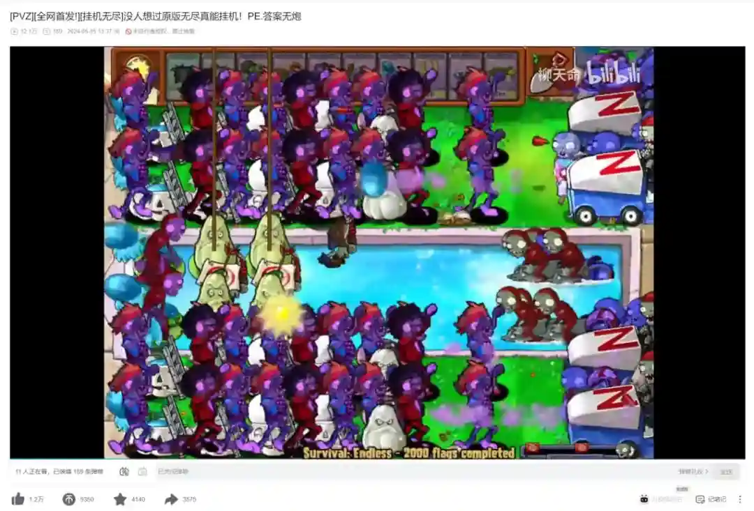 同样在这一天,一位网名叫做“柳天命”的国内玩家,也在B站上传了自己的献礼——展示了一个一旦成型便无需再操作,能够在原版PVZ的无尽生存模式中“挂机”的阵型。