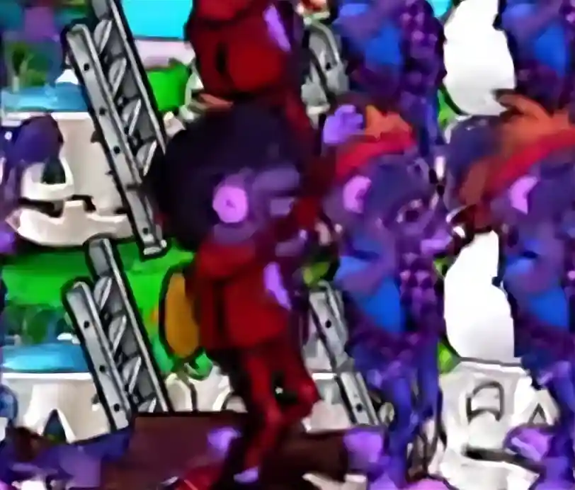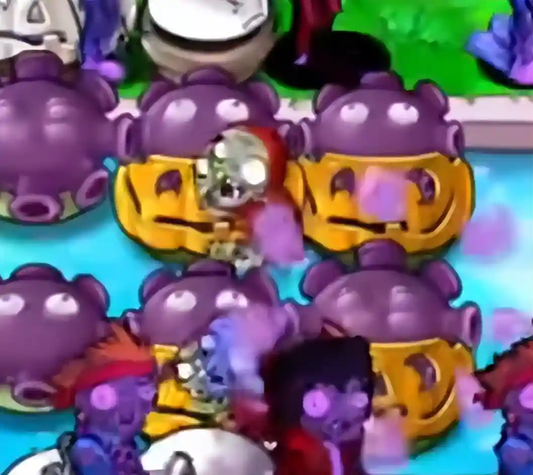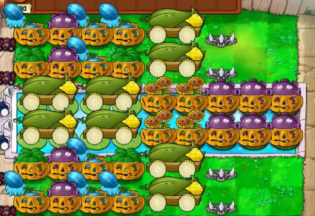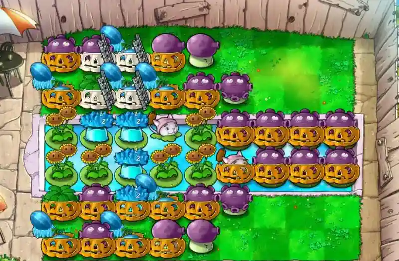 通过故意让扶梯僵尸在南瓜上架梯子,可以让巨人投掷的小鬼僵尸自动越过植物(然后被阵型的输出灌死),啃不到一丁点南瓜,同时冰瓜投手也能通过减速将僵尸大军的前线尽可能压在屏幕外。